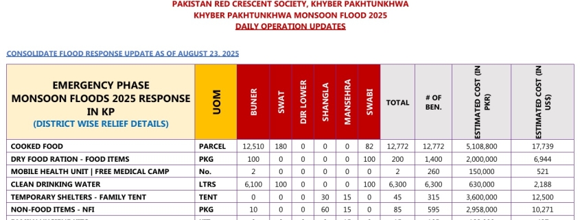 PRCS KP has reached more than 23,300 beneficiaries across flood-affected districts including Buner, Swat, Dir Lower, Shangla, Mansehra, and Swabi, with total relief assistance valued at PKR 16.41 million (USD 56,978).