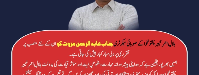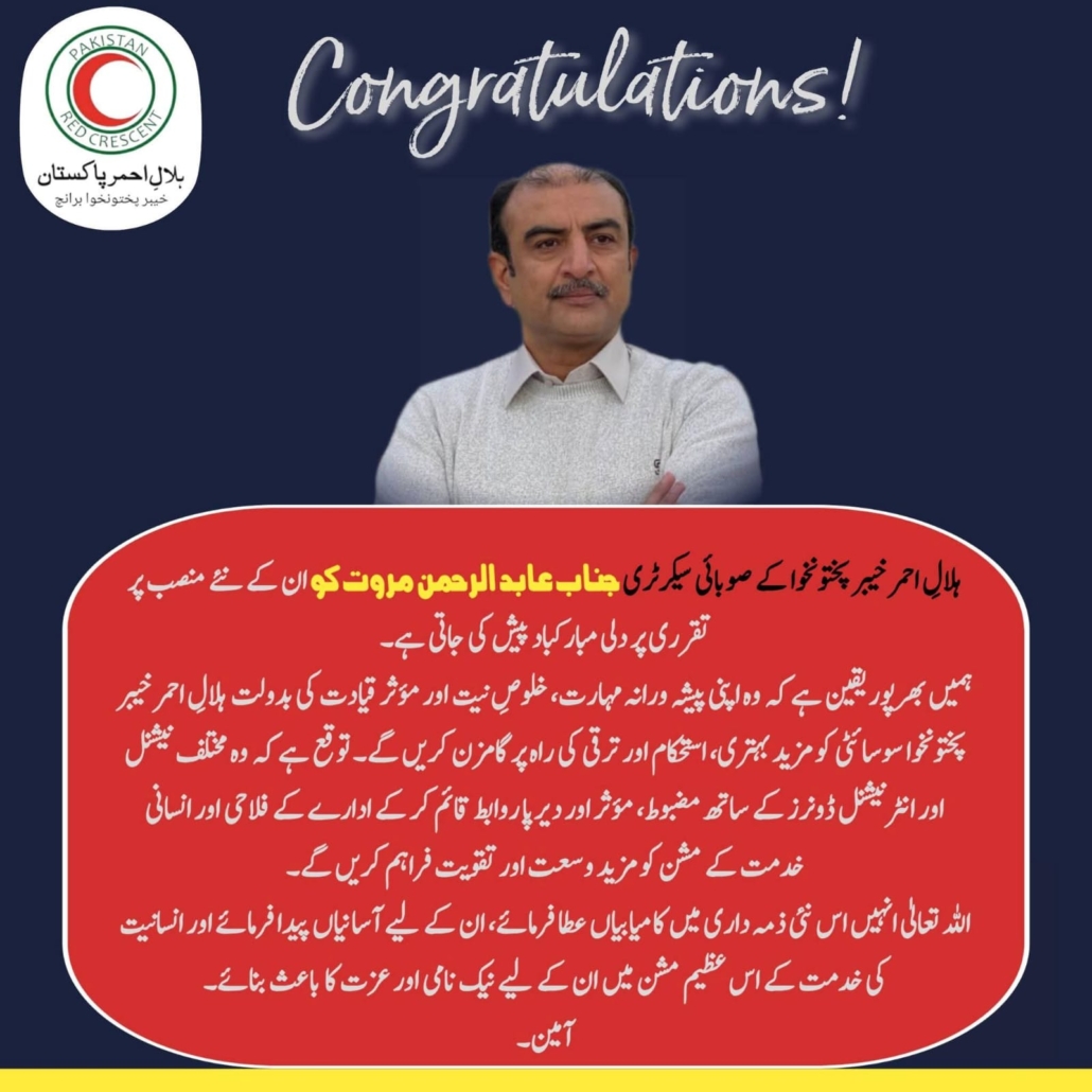 The Pakistan Red Crescent Society Khyber Pakhtunkhwa (PRCS KP) extends its heartiest congratulations to Mr. Abid-ur-Rehman Marwat on his appointment as the Provincial Secretary of Khyber Pakhtunkhwa Red Crescent Society. This appointment marks an important milestone for the organization as it continues to strengthen its leadership and institutional capacity in pursuit of its humanitarian mission.